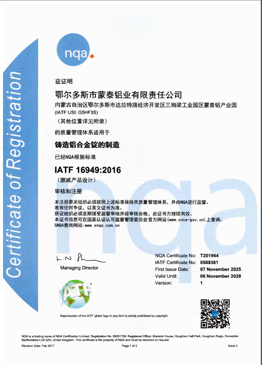 近日,铝硅合金熔铸中试厂取得了IATF 16949汽车行业质量管理体系认证证书,这标志着公司成功获取进入汽车用铝合金材料供应链的“金钥匙”。